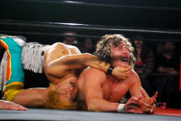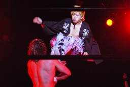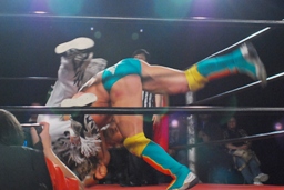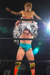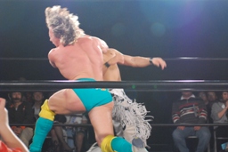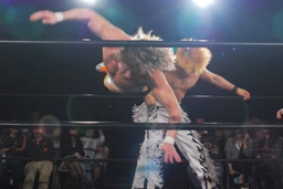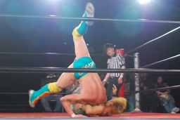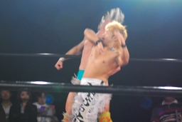 コーナーに上ってスワントーンボム、ケニーはこれをヒザを立ててブロック(左写真)。MIKAMI「電流が走った」(mixiの本人の日記より)
