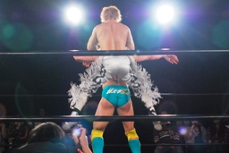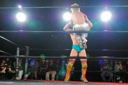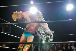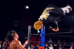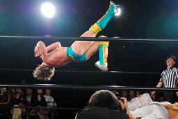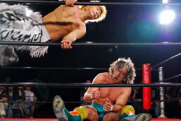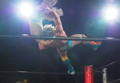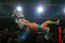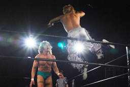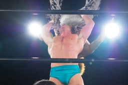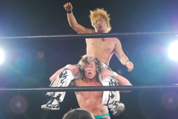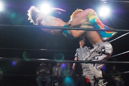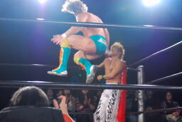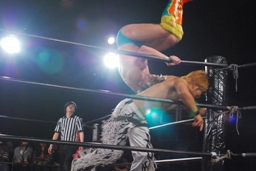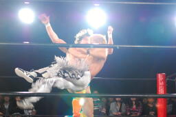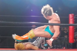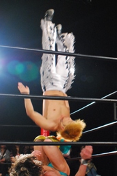 MIKAMI後ろ向きにコーナーに立つとスーサイドボム(左写真)、ヒットポイントがズレたせいかカバーが遅れたせいかカウント2でケニー返す。