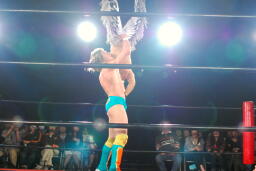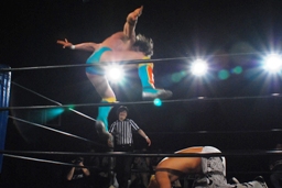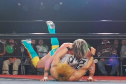 MIKAMI着地、ロープワークからケニーの低空ドロップキックをジャンプでかわしティヘラに(右写真)。5分経過。