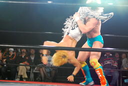 放り投げてMIKAMIを270°回転させてヒザに当てるバックブリーカー(右写真)。やられる方はたまらんだろうがケニーはこういう奇想天外な技をやるのも魅力。