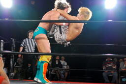 MIKAMIがスワンダイブミサイルキックで先制(右写真)、ケニーは場外転落。