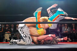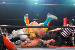 MIKAMIはパワーボムに、押さえ込む(左写真)、カウント2。