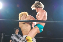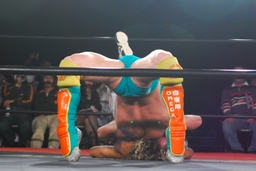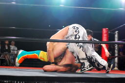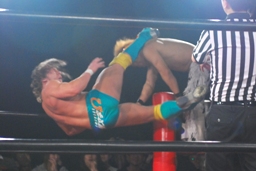 首投げから助走付けてスライディングキック(右写真)、カウント2。