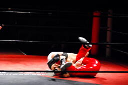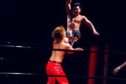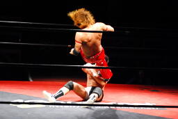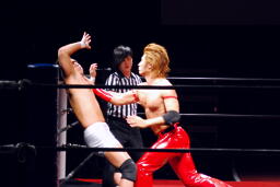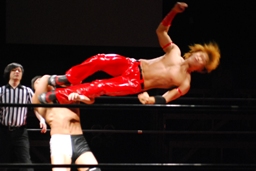 平田コーナーに上ってミサイルキック(右写真)、カウント2。