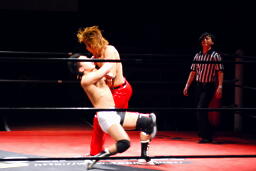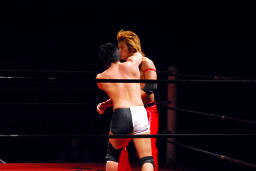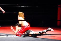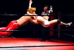 平田がロープに飛ぶ、高尾かわしてバックスタバー(左写真)、立ち上がったところにトラースキック、カウント2。