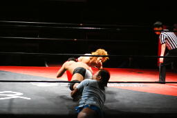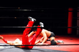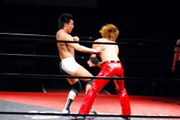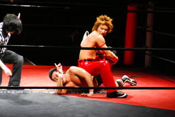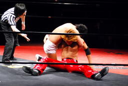 高尾強烈な張り手から逆片エビ(左写真)、平田ロープ。5分経過。