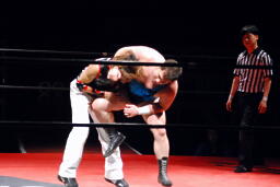 アントン首投げからスリーパー(左写真)、凛音ハンマーロックに切り返す。アントン切り返してネックロック、首の取り合い、ブレーク。