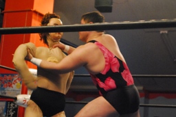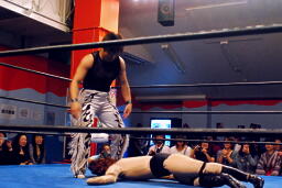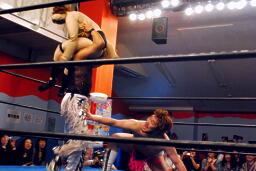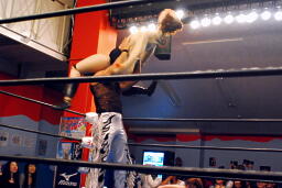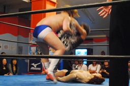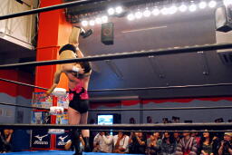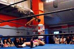 ヨシヒコ立ち上がるとコーナーを駆け上がって不知火(左写真)、カウント2。アントンはコーナーに戻ってMIKAMIにタッチ。