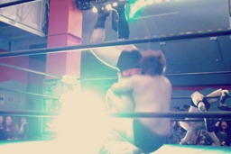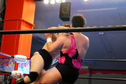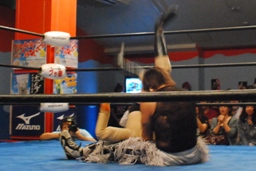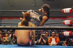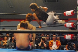 コーナーに上ってヨシヒコにスワントーンボム(左写真)、しかしカウントは2。