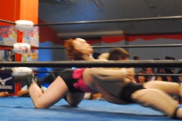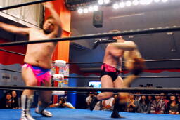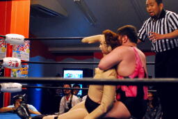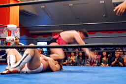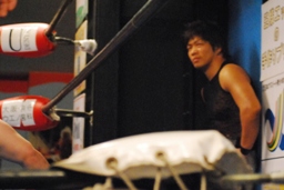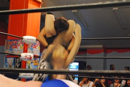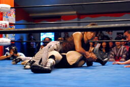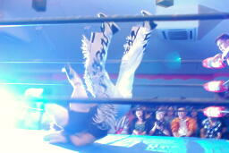 MIKAMIセントーン(右写真)、カバー、これもディーノがカット。ディーノ「もっとこう、ヨシヒコの良さってもんを!」ディーノはヨシヒコをコーナーに連れ帰ってタッチ。MIKAMIもアントンにタッチ。5分経過。