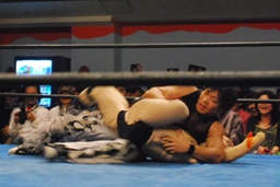 ヨシヒコエビ固め、カウント2。ヘッドシザーズで切り返す(左写真)。