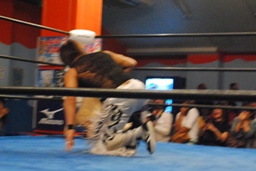 9回転後超高速でヨシヒコをターンバックルに投げつける(左写真)。カバーはディーノがカット。10分経過。