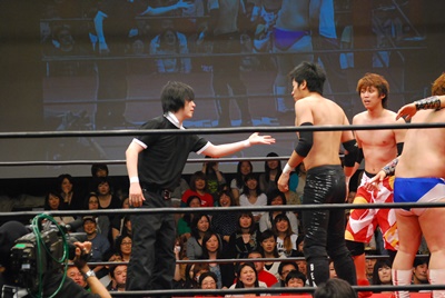 股間もまさぐる。リーがまた木曽レフェリーを問い詰める(右写真)。