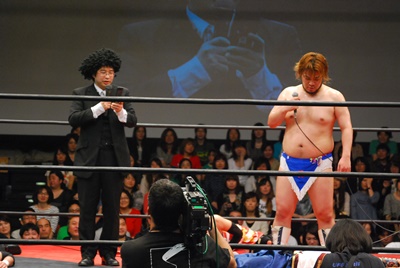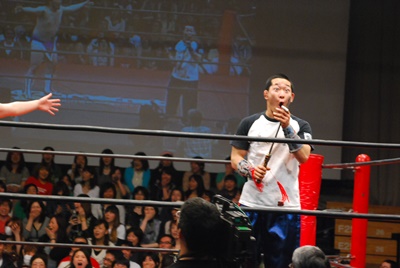 鶴見GMがリングに(右写真)。今日の@Bob_Gameのツイートは「コンニチワ。ボブ・サップデス。ウソ!?ボビートクセンタイモタオシタノ?ナンテコッタ!センイソウシツシテシマイソウダゼ。ダガ、ゲームハオワラナイ。5ガツ29ニチノキョウト二ヤツヲオクリコムカラナ。ツギノハフウガワリナヤツダゼ。イママデニイナイタイプナノデオタノシミニ」ということで次回4thシーズンは京都KBSホールで。