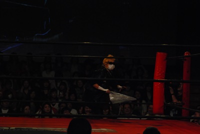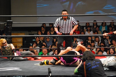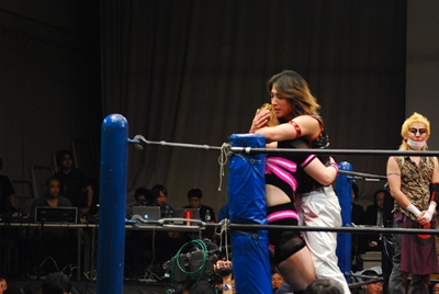 そして先ほどの「事故」について観客に謝罪をしているとその心のスキを突いてニラがロケットパンチ、さくらがラ・マヒストラル(左写真)、カウント3。