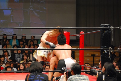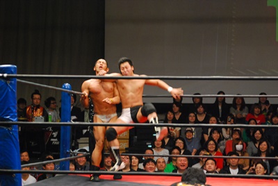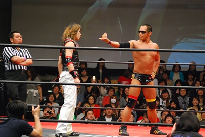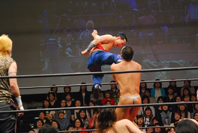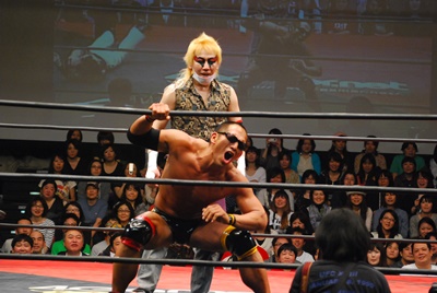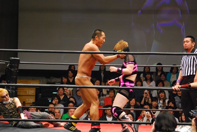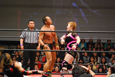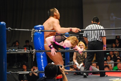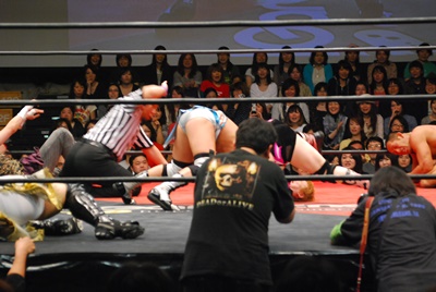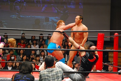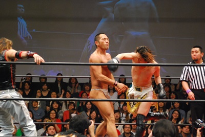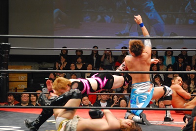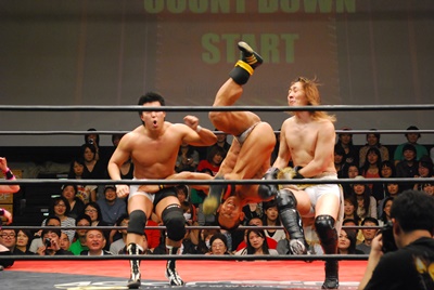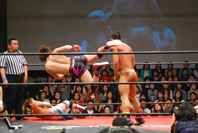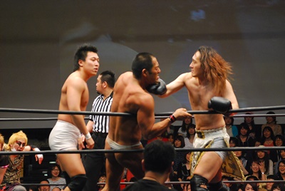 平田と鳥羽が2人でマイケルを攻撃(右写真)、マイケルエプロンに。下からシュウがカンチョー攻撃。