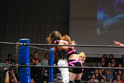 マイケルをコーナーに振って平田が串刺しエルボー(右写真)、マイケルは凛音にエルボー。
