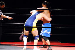 ロックアップ、福田ヘッドロック(左写真)、彰人切り返してヘッドロックからフライングメイヤー、福田ヘッドシザーズでブレーク。