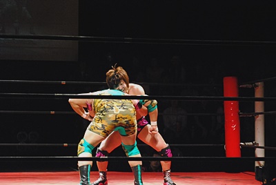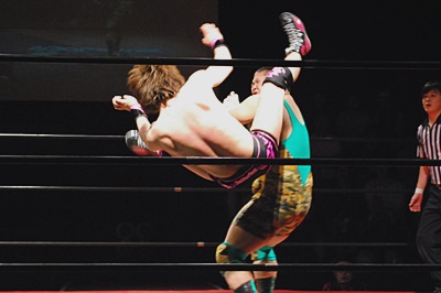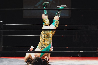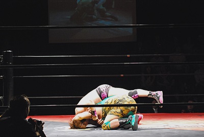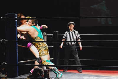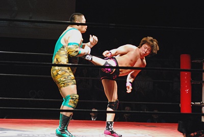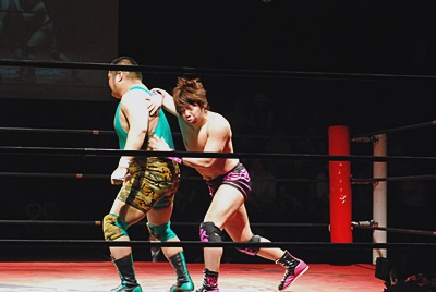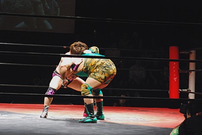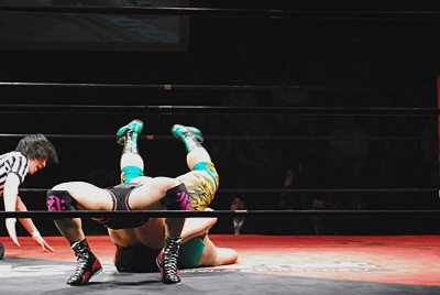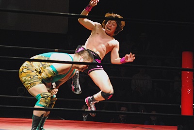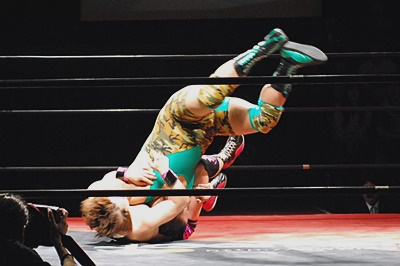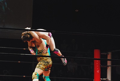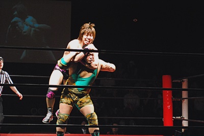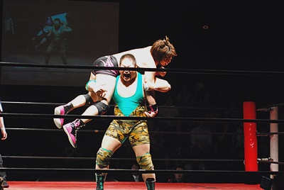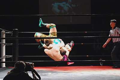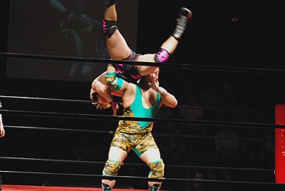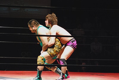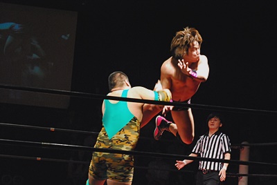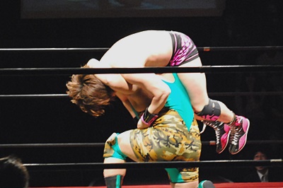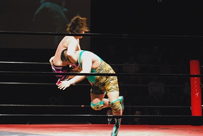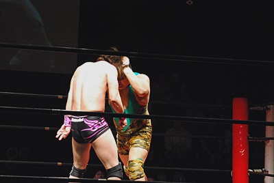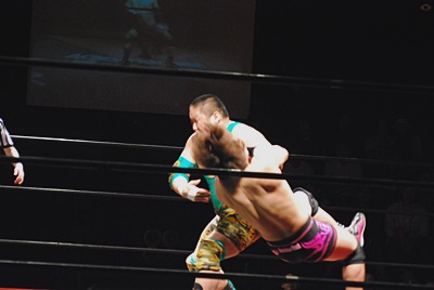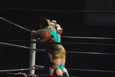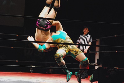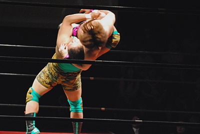 リリースしてダブルアームDDTの体勢、入江ブロック(右写真)。
