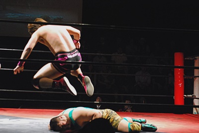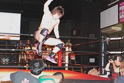 コーナーに上って後頭部にミサイルキック(左写真)。