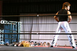 ゴングが鳴るとニラ突進、MIKAMIかわす(右写真)、