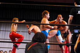 HARASHIMA肩に担ぐ、松永背後に着地、コーナーに押し込むと高尾がハイキック(左写真)。
