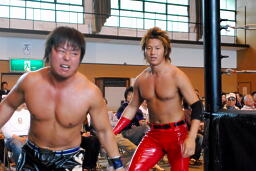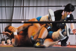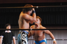 高尾ミサイルキック(左写真)、みちのくドライバー、カウント2。