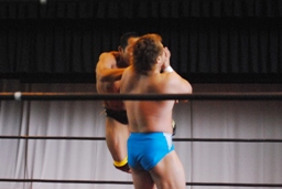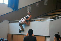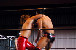 松永マイケルをコーナーに振って突っ込む、マイケルカウンターのキック。松永再度突っ込む、マイケル今度はバックエルボー、そしてスピアー(右写真)、HARASHIMAにタッチ。