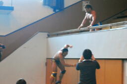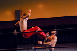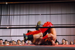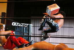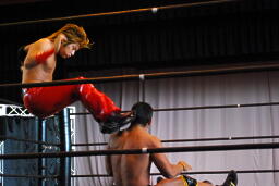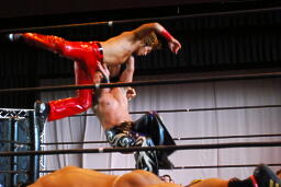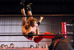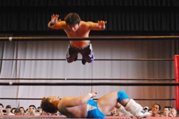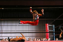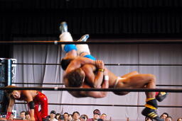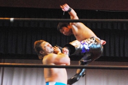 HARASHIMAロープに振ってヒップトス、エプロンに出るとスワンダイブプレス(右写真)、カウント2。
