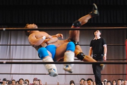 マイケルトラースキック、松永キャッチ、松永アッパーブローからバックドロップ((右写真)、高尾にタッチ。