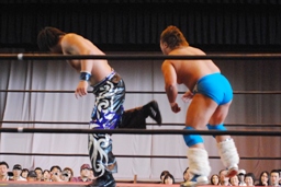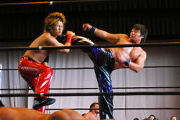高尾コーナーで踏みつけ、首投げから後頭部にドロップキック(左写真)、カウントは1。場外に出す。