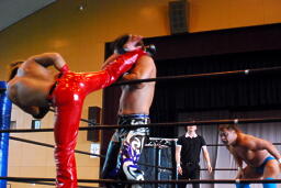 松永が入ってロープに振る、マイケル切り返してドロップキック(右写真)。松永サミング、コーナーに連れ帰って高尾にタッチ。