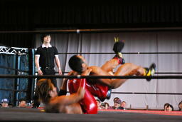 HARASHIMA「チェストー!」ミサイルキック(左写真)。5分経過。