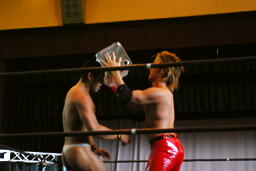 松永マイクを取ると「俺達が最強ヒール軍団シットハートファウンデーションじゃー!おい中澤マイケル、お前自分で東京一面白いとか言ってるらしいな。じゃあここにいる蒼馬様をお前の一発ギャグで笑わせてみろ!爆笑王!」(左写真)ヒールが無茶振り!
