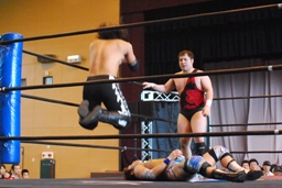 KUDOアントンをコーナーに振って8×4(左写真)、コーナーに上ってダイビングダブルニーアタック、アントンかわす。
