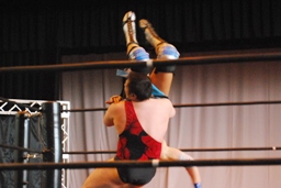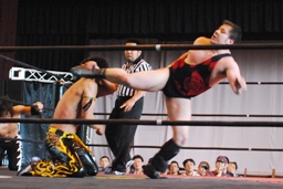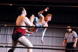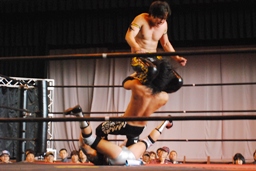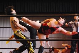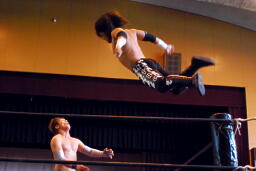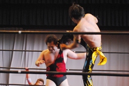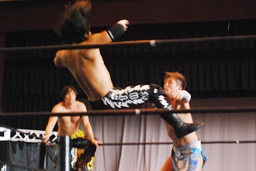 エルボーの打ち合い、アントンニーリフト、ロープに飛ぶ、大石カウンターのドロップキック(左写真)。アントンタッチを阻止しようとするが大石キック、KUDOに第二ビングタッチ。