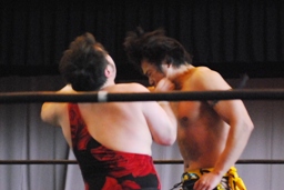 佐々木と大石ロープワークからアームホイップの打ち合い(左写真)、