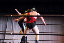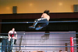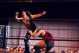 2人コーナーに上って、まず佐々木がダイビングエルボードロップ(右写真)、続いてアントンも飛ぼうとするが大石が足を押さえる。