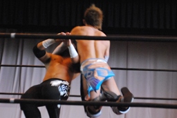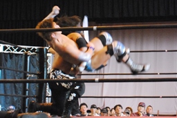 アントンがストンピング、ロープ際にセット、佐々木がコーナーからヒットマンエルボードロップ(右写真)、カウント2。アントンにタッチ。5分経過。