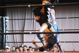 大石がカタプルパで持ち上げた佐々木にKUDOがダイビングダブルニーアタック(右写真)。