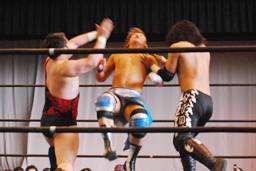 大石コーナーに振られるが串刺し攻撃をかわしてアントンと佐々木を同士討ちに。コーナーに飛び乗ってアントンに絶品(右写真)、KUDOにタッチ。