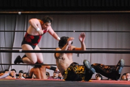 そしてハイファイヴエルボードロップ(右写真)。大石ストンピング、ガットショット、ロープに振る、佐々木切り返す、アントンがエプロンからキック。佐々木はアントンにタッチ。