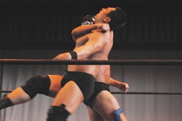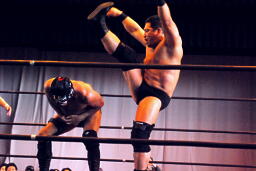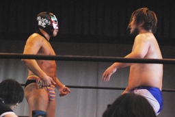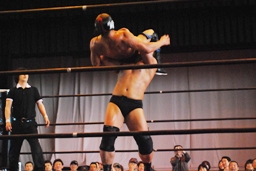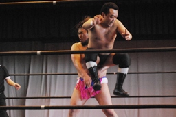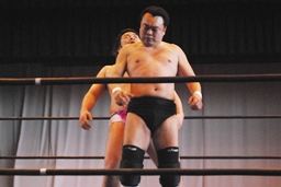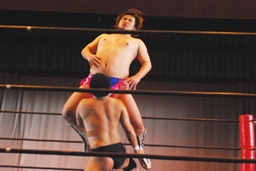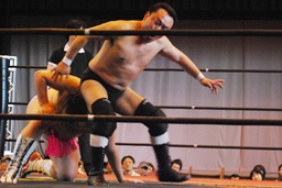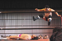 沼二郎ロープに飛んでジャンピングヒップアタック(左写真)、ディーノキャッチ。