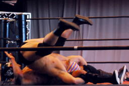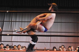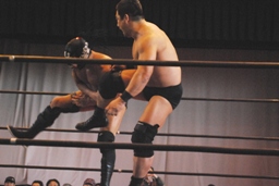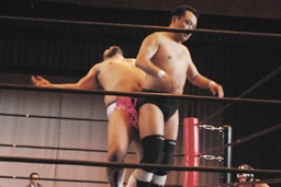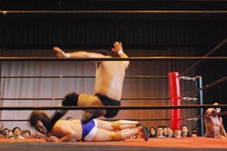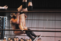 沼二郎コーナーに上ってダイビングギロチンドロップ(右写真)、カウント2。