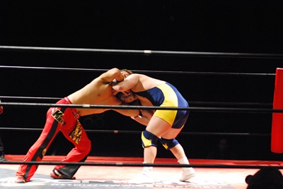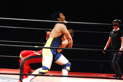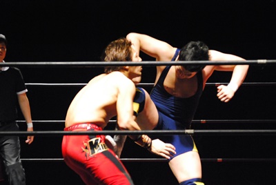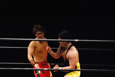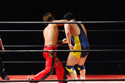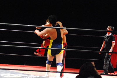トウナイヘッドロック、福田ロープに振ってショルダーブロックの打ち合い(左写真)。