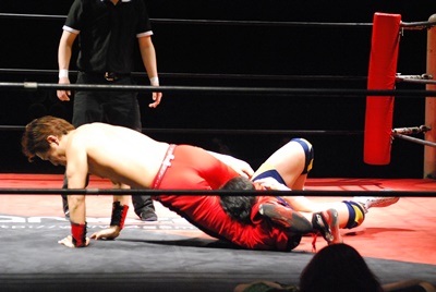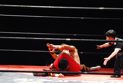 腕に足をねじ込んでバンプ(左写真)、腕にキック。福田ロープ。5分経過。