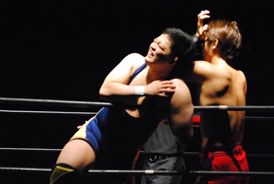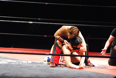 背後からフェースロック(右写真)、アームロック。ホイップしてさらにアームロック、福田ロープ。