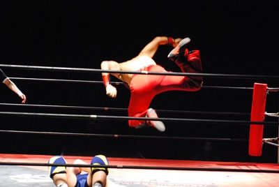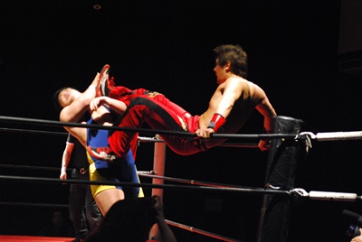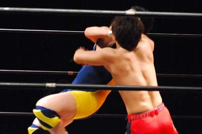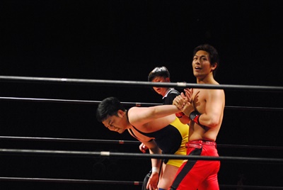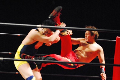 福田ダブルパンチ、ガットショット(左写真)、ロープに飛ぶ、トウナイドロップキック。