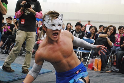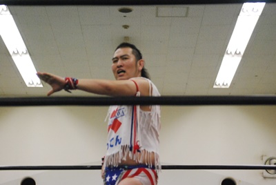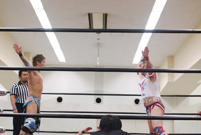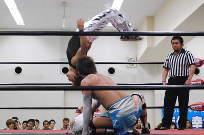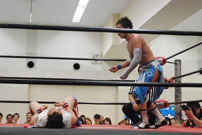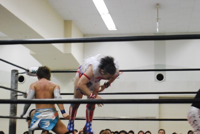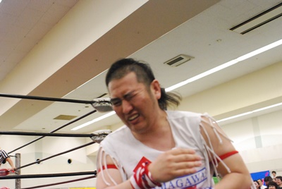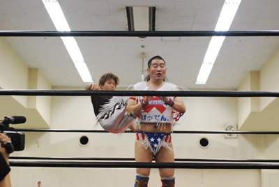 ばってんがコーナーに上る、大石がMIKAMIを押さえる(右写真)。