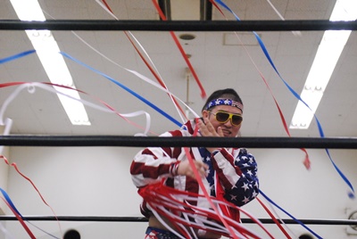 MIKAMIと大石ダブルでロープに振る、ばってんはクローズラインをブレークして2人にばってんボンバー(左写真)。